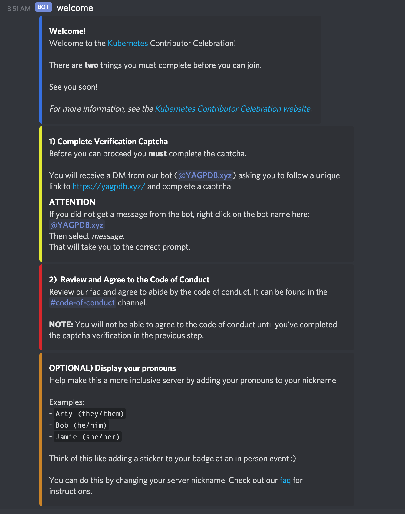 #code-of-conductchannel. There you will need to read and agree to the Code of Conduct by clicking on the Kubernetes emoji. This must be done before you can access any other channels within the server.